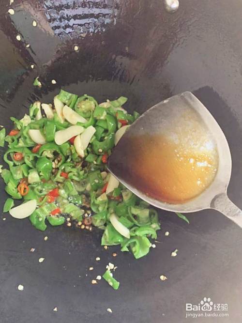 加入少许醋、生抽,翻炒至辣椒变软时,加入盐。