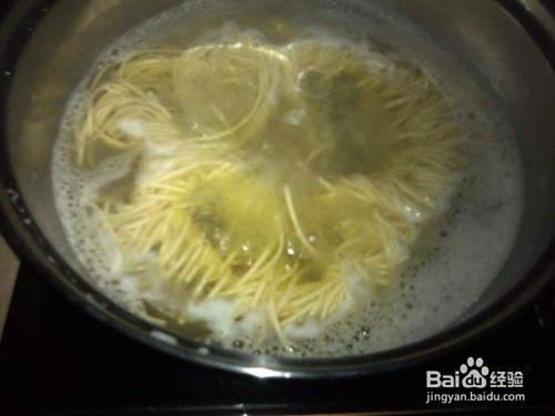 并事先准备好一定数量的香菇和青菜。放入锅中,与面条一起煮。煮大概1分钟就可以了。
