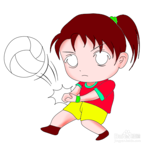 用黑色涂出眼珠的底色,其上用白色涂出高光;排球用淡红色作为底色,用白色对整体出涂出高光区,如图所示。