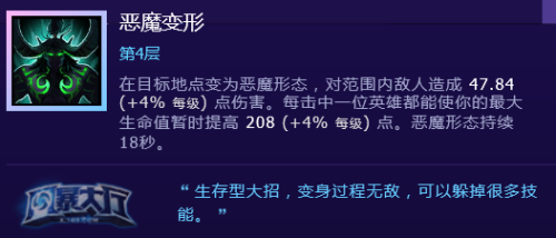 变身恶魔,毫无疑问的,伊利丹的招牌技能,如果你选另外一个,就真的是走刺杀路线了,优势局可以选那个,这里建议变身,毕竟配合永久变身还是很6的