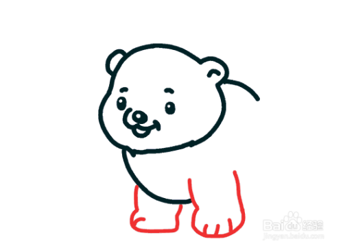 画出小熊的后腿和熊掌上的爪子,然后画出小尾巴。
