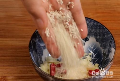 把酸菜和泡椒切成段,再切一点葱,花椒,干辣椒,姜与泡椒放在一起。蒜切碎后和白芝麻放在另一个碗里。