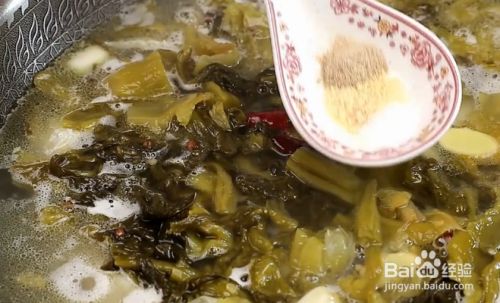 接着把酸菜放进去,倒入料酒,放入食盐,鸡精和白胡椒粉。