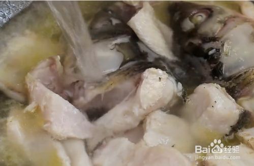 再次起锅烧油,放入鱼骨煎至两面金黄,然后倒入水。