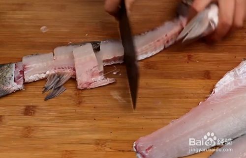 将另一半也切开,鱼肉切成片,鱼骨剁成块,再把鱼头切成两部分。