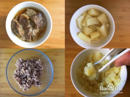 将牛肉和土豆同时放入蒸锅蒸20分钟。蒸熟后用料理机把牛肉打成牛肉泥,土豆用利其尔食物研磨器研磨成土豆泥。