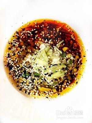 再依次放入姜丝、熟芝麻、花椒面、干辣椒面。(叠放顺序很重要,辣椒面一定要放在最顶层。)