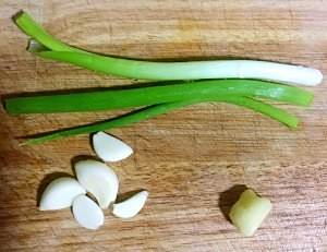 䓤切成小段,蒜切小粒,姜切丝,再准备适量的熟芝麻和干辣椒面。(没有干辣椒面可以换成油泼辣子,那样味道稍逊色一些。)