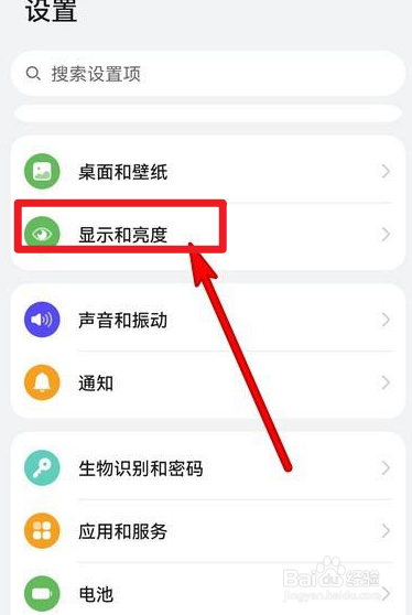 首先我们打开手机设置页面,点击显示和亮度。