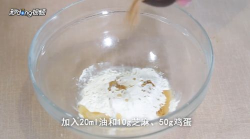 将面粉中,加入油和芝麻、鸡蛋、白砂糖,再加入水搅拌均匀,揉成面团。