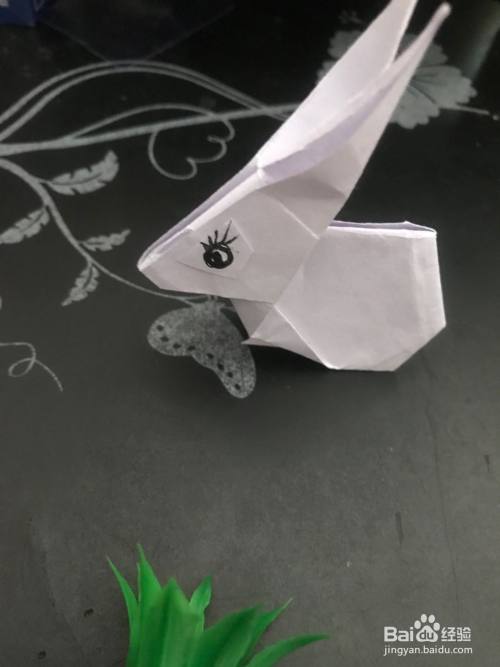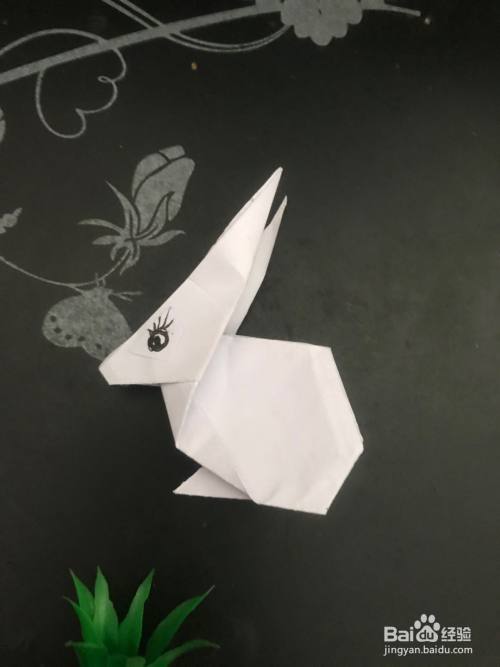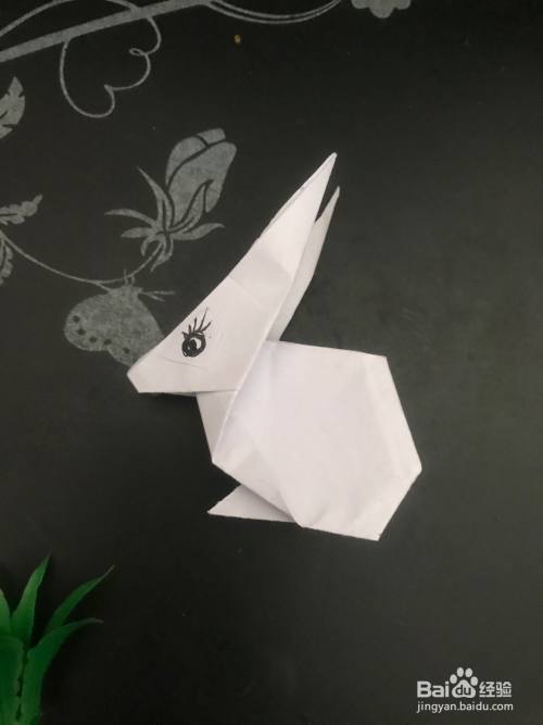 第七步 向里回折好之后 再把后面向里折一下突出的尖角 然后再整理一下 捏折一下它的大耳朵 再用黑色水笔给它画上眼睛就行了
