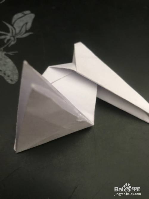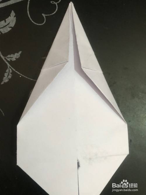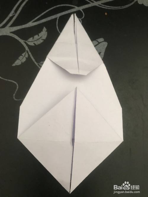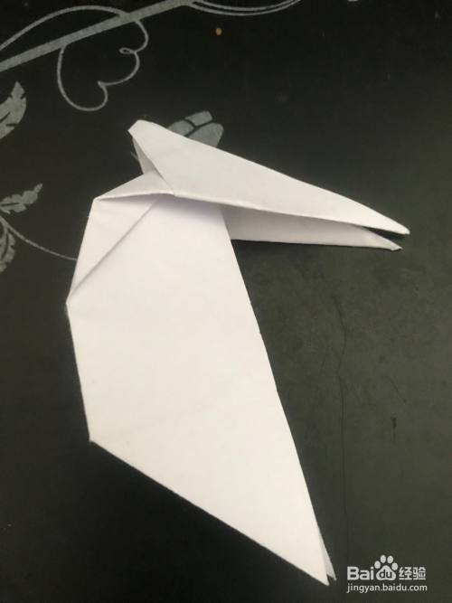 第四步 折好之后 把它左右翻过来 再拿起来三角向背面翻折 从不开的三角上向里折一个小三角作为它的嘴巴