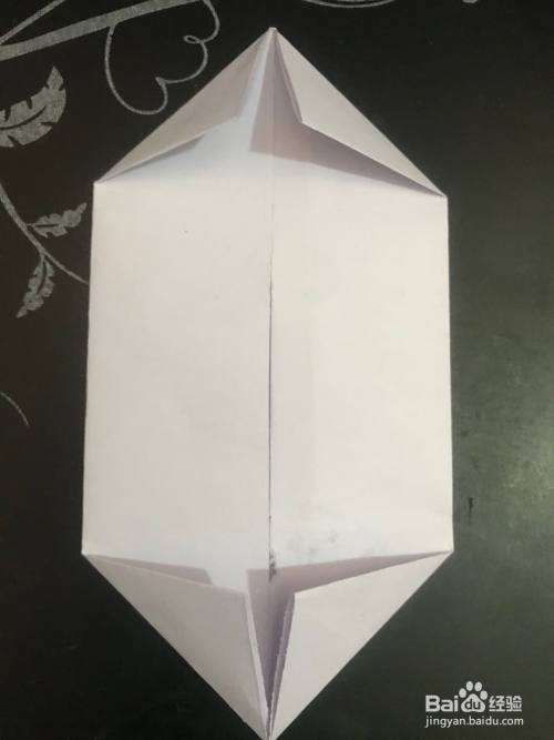 第三步 四个角都向里折叠好之后 再把它们取开 按折痕向里回折 然后把两头的底层尖角折向背面 再把上头两个角向里沿中线折倒