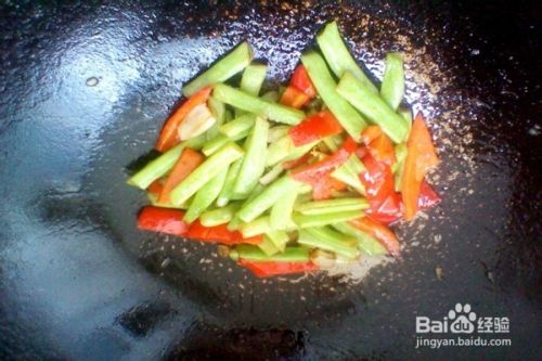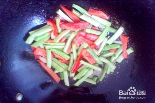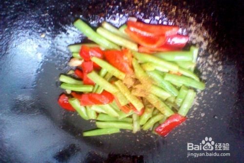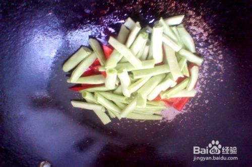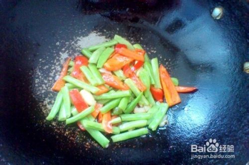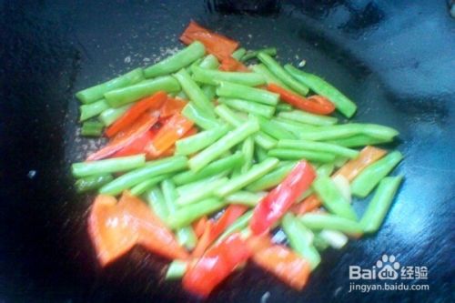 等闻到大蒜炸香的时候,把盘中准备好的四季豆和甜椒倒入锅中,翻炒几下。