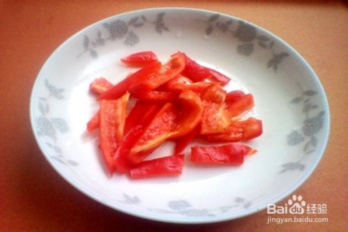 把红甜椒切好小块状放入盘中。