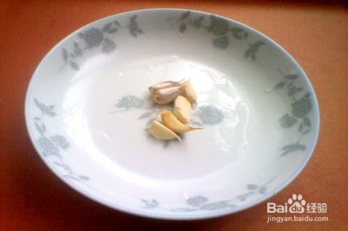 用刀背把大蒜拍扁,剥去外皮后,放入盘中。