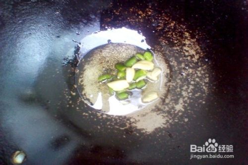 等锅中的油烧热时,在锅中加入青尖椒和大蒜,翻炒几下,