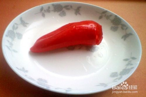 取1个红甜椒,去除根部和籽后,放入盘中。