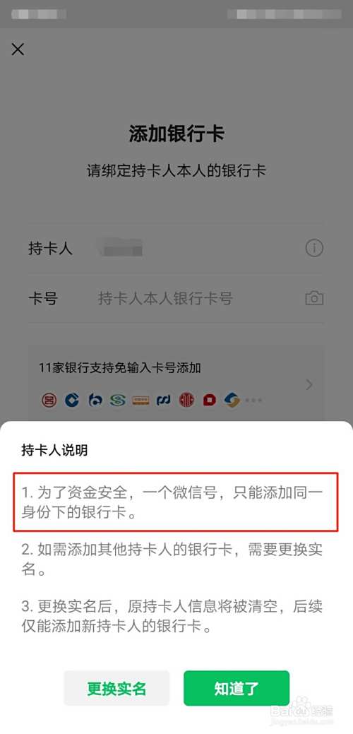 由持卡人截图说明可知:一个微信号只能添加同一身份下的银行卡。因此,微信不能添加别人的银行卡,若需添加其他持卡人的银行卡,需要更换实名。