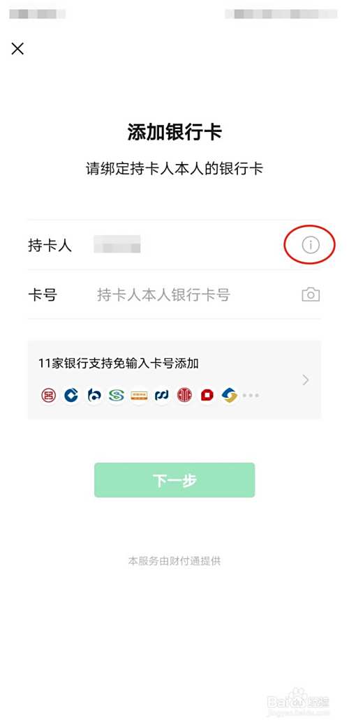 在添加银行卡界面,选择此卡人右侧的感叹号符号“!”,进入持卡人说明。