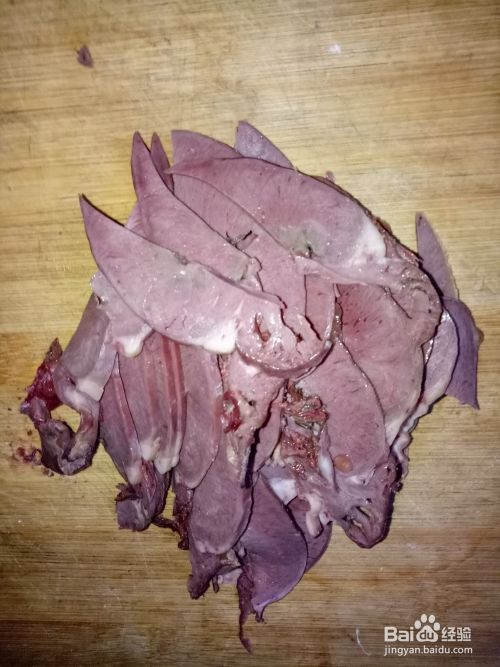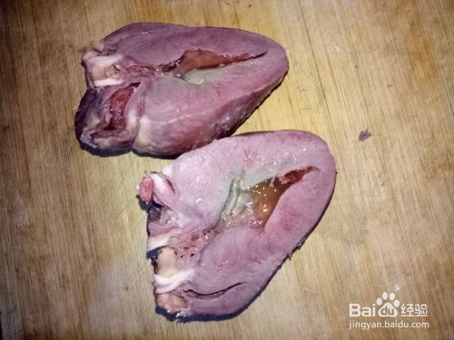 如图所示,把猪心从中间切成两块,把切面放到案板上,切成薄片放到碗内备用。