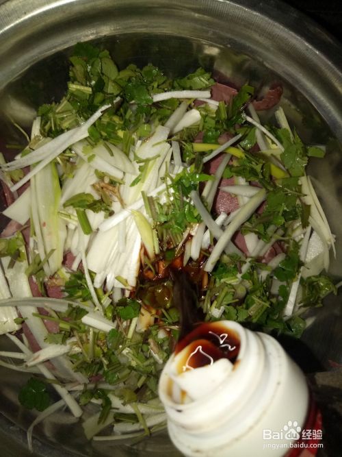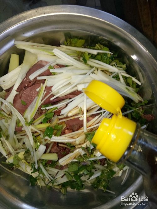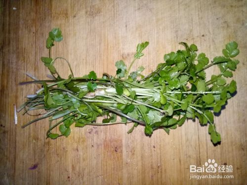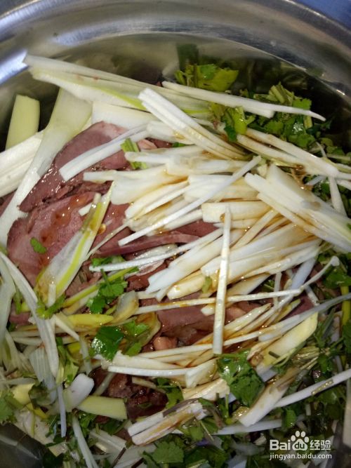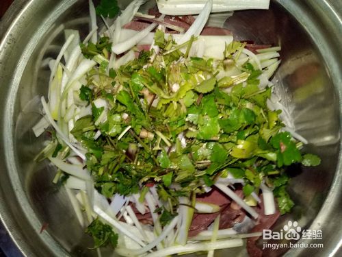 准备配菜:准备一棵大葱,取葱白部分且葱丝用。取香菜,去掉老爷,洗净备用。