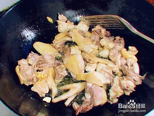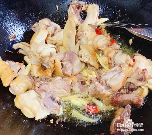 油烧热,放鸡肉,这里先不放生姜蒜,因为要先把鸡肉煎成金黄色,还有一个这一步可以更好的把鸡皮上多余的油煎出来,鸡肉更香。