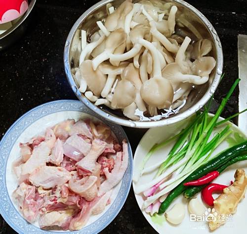 食材都准备好,鸡肉不用焯水,但可以在洗干净后再用热水过一遍。然后用料酒和盐(盐放一点点)腌制一会。平菇太大的可以撕成自己想要的样子。辣椒嘛,看自己吃不吃辣,其实现在辣椒普遍都不辣,所以可以用来调味。