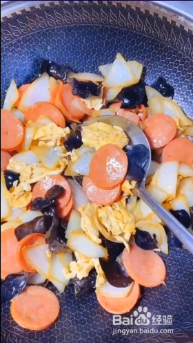 锅中再倒油放入香肠,洋葱翻炒均匀加生抽,蚝油,清水,木耳,鸡蛋,盐,鸡精,十三香大火翻炒均匀即可。