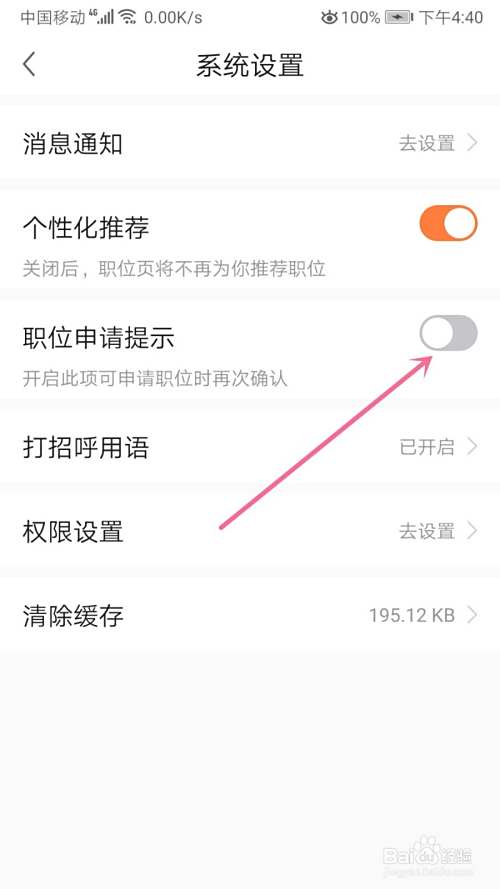 进入系统设置界面找到职位申请提示栏选择“切换开启”的状态。