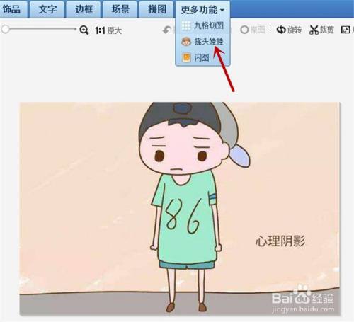 在美图秀秀中插入一张从本地电脑中挑选的图片,鼠标移到更多功能旁边的倒三角图标上,从弹出的下拉列表中点击摇头娃娃