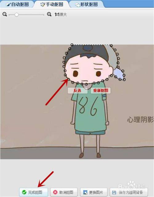 进入抠图界面,使用鼠标在图片头部周围绘制虚线点直到闭合,然后点击下方的完成抠图按钮