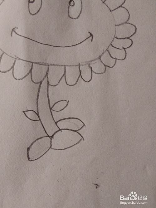 在下面画上向日葵的杆,不要画太长。在两边画上一对小的叶子。在下面接着画上大的叶子。链接起来。