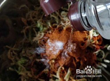 第四步,搅拌均匀之后,再给盆中放入辣椒粉、盐、味精和糖稀再次搅拌均匀。