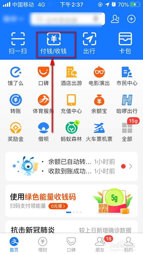 1.当前我们打开支付宝软件,上方有一个是付款和收钱按钮。