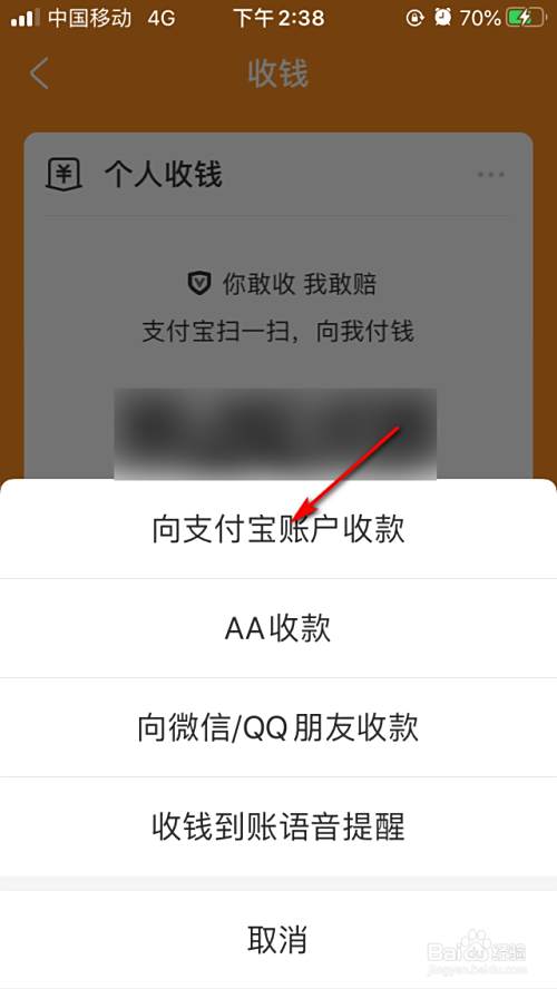 4.然后弹出对话框,选择向支付宝账户收款。