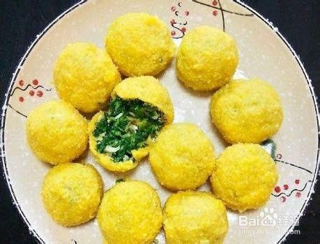 在馅料中加上点生抽、食盐和香油,用筷子将其充分搅拌均匀,再用手将调好的馅揉成一个个的团子,准备一个盘子,放入适量的玉米面粉,将做好的菠菜团子先放入玉米面中裹一圈;
