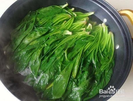 菠菜一把将其摘去根蒂后,仔细清洗干净,然后在锅中添上水,待将水烧开后,隔水放入菠菜,焯烫1分钟即可捞出,不烫手的时候将其中的水分挤干,然后将菠菜切碎;