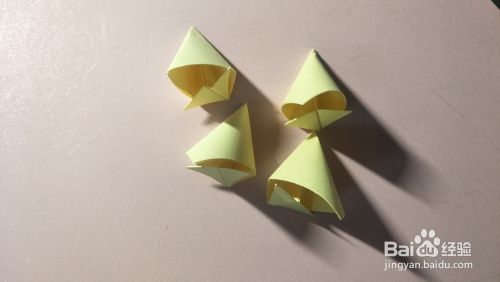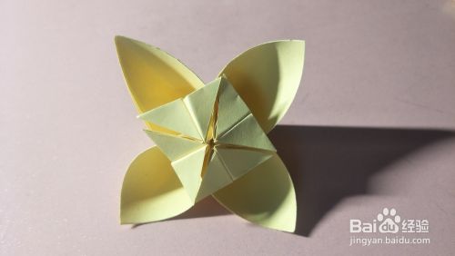 将四个组件用胶水如图固定在一起,一朵带花蕊的四瓣花就折好了。