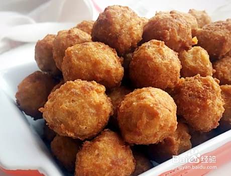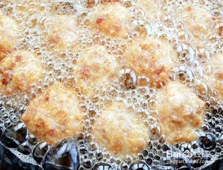 开始炸肉丸,小火慢慢将肉丸炸至定型的时候,捞出来控下油,重新将锅中油烧热,放入炸好的肉丸复炸一遍,炸至金黄酥脆就可以出锅了。