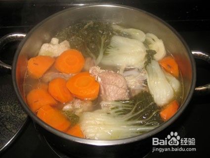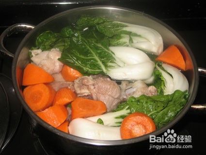 将猪大骨汆水,然后和白菜、胡萝卜,蜜枣一起入锅加水烧开,文火煲2小时。