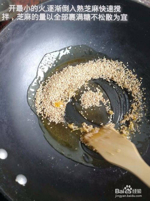 开最小的火,逐渐倒入熟芝麻快速搅拌,芝麻的量以全部裹满糖不松散为宜。