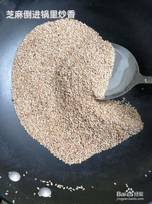 芝麻倒入锅中炒香。