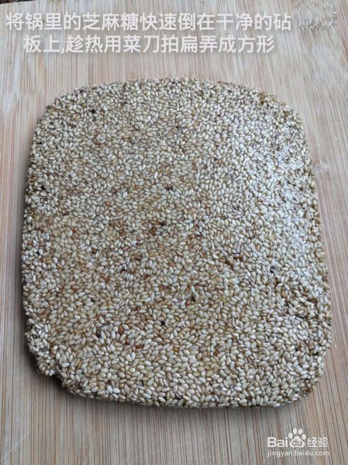 将锅里的芝麻糖快速倒在干净的砧板上,趁热用菜刀拍扁制成方形。
