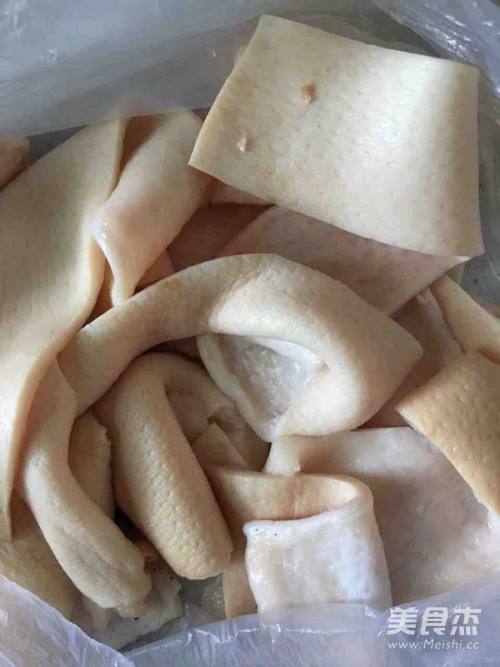 5剃干净的肉皮切成小条状。