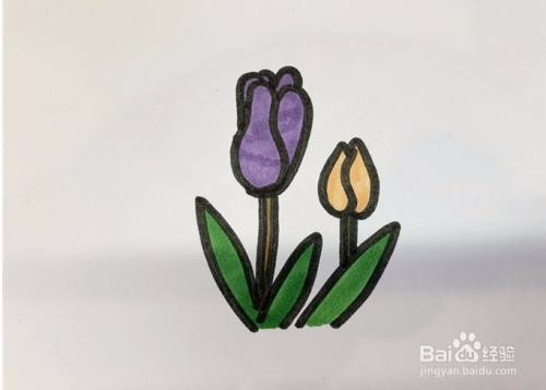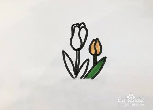 在画好的花朵旁边再画出一朵较小的百合花后,将花朵涂红,茎叶涂绿。