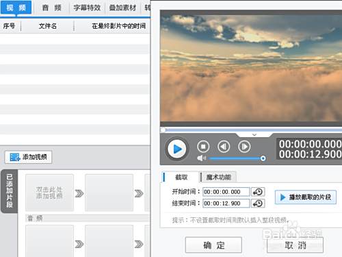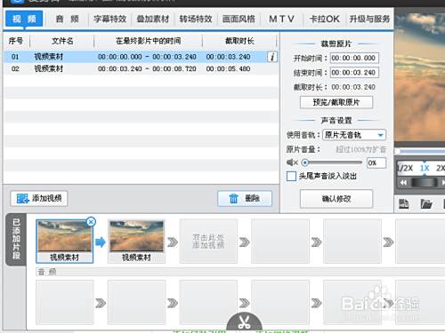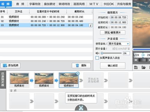 播放视频找到截取的开始位置,点击下面的剪刀,将视频进行分段操作,在“已添加视频中”就会出现两段视频。