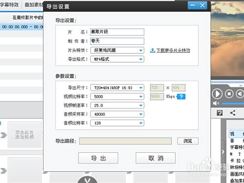 点击右边的导出视频按钮,在导出设置中采用默认设置,点击导出按钮,将视频进行导出。