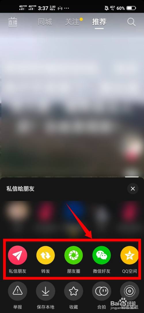 在底部弹出的面板中,点击红色方框里面的选项,将抖音作品分享到各大社交媒体。
