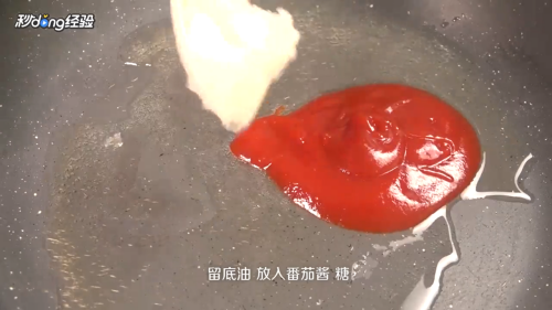 留底油,放入番茄酱、糖、醋,熬成汁。